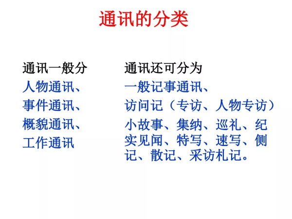 通讯的分类:它包括人物通讯和事件通讯两类,特写也是通讯的一种。