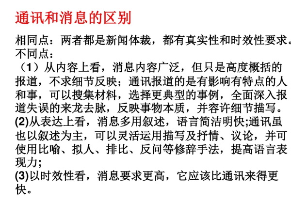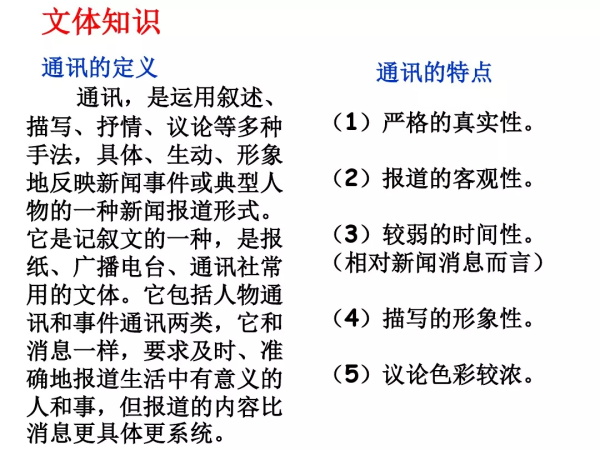 通讯的特点:严格的真实性;报道的客观性;较弱的时间性;描写的形象性;议论色彩较浓。
