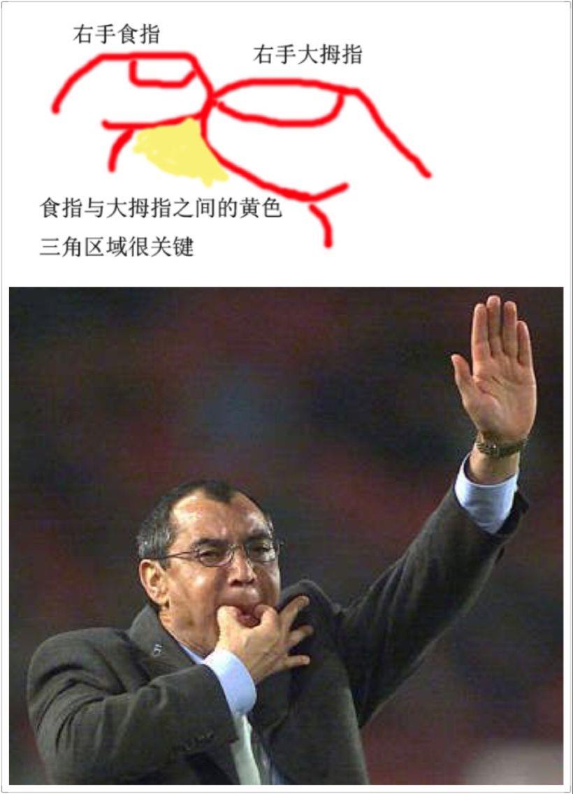 方法一:最常见的一种,就是用大拇指和食指相掐,放入嘴中,轻轻吹就可以,不用用力吹,注意不要让气从嘴巴旁边漏出,要让气从下图食指与拇指之间的黄色三角区域吹出。