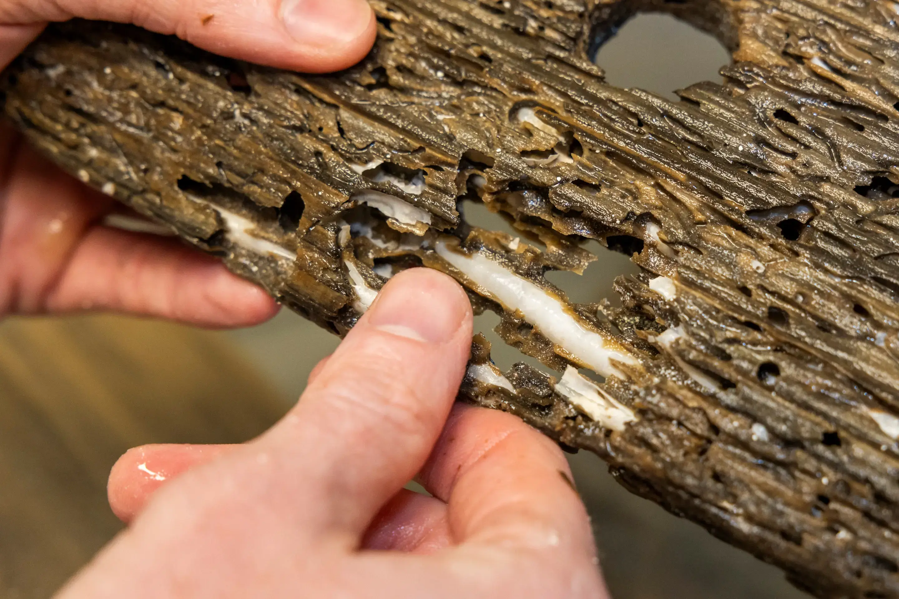 蛀船蛤长得像蠕虫,实际上是双壳软体动物的一种。这意味着它们与蛤、贻贝和牡蛎有亲缘关系。不过,由于它们一生都被保护在所吃的木头里,所以只有前端有一个小小的壳,帮助它们钻木。