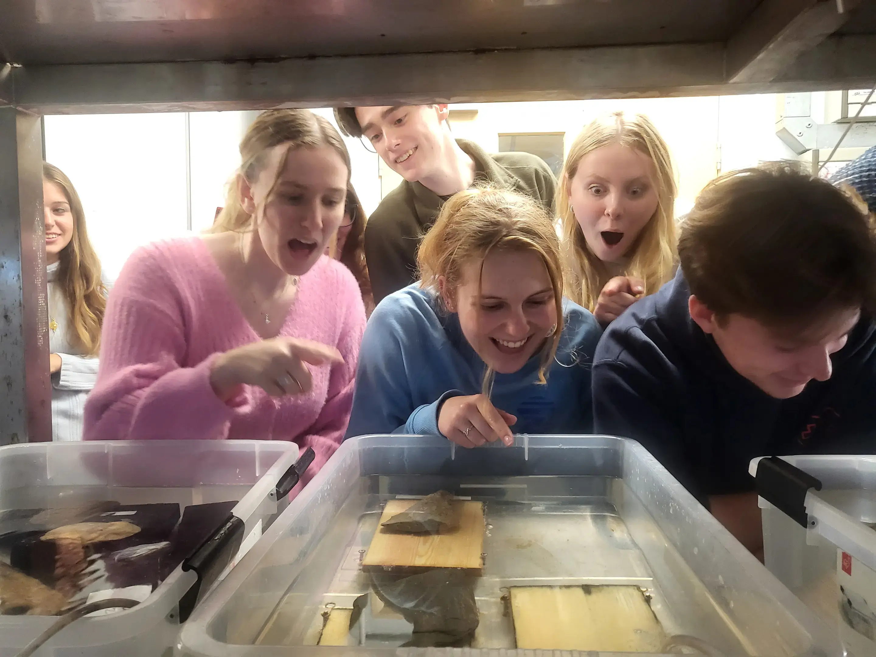 一组学生查看蛀船蛤养殖池 图/普利茅斯大学