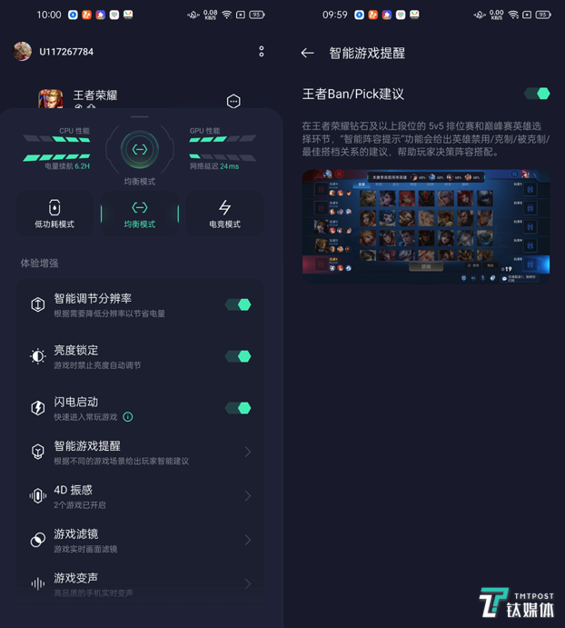 针对游戏场景,ColorOS11.1系统通过Hyper Boost 4.0也进行了优化提升,其中,用户可以自定义振感、手感调节,针对《王者荣耀》更深入优化。