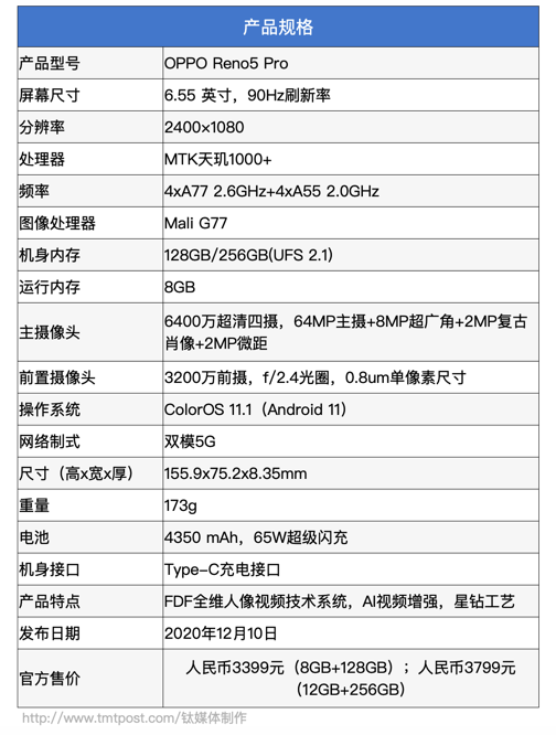 硬件方面,Reno5 Pro搭载了MTK的天玑1000+处理器,相比较前代作品采用的骁龙765G在性能方面稍有提升。