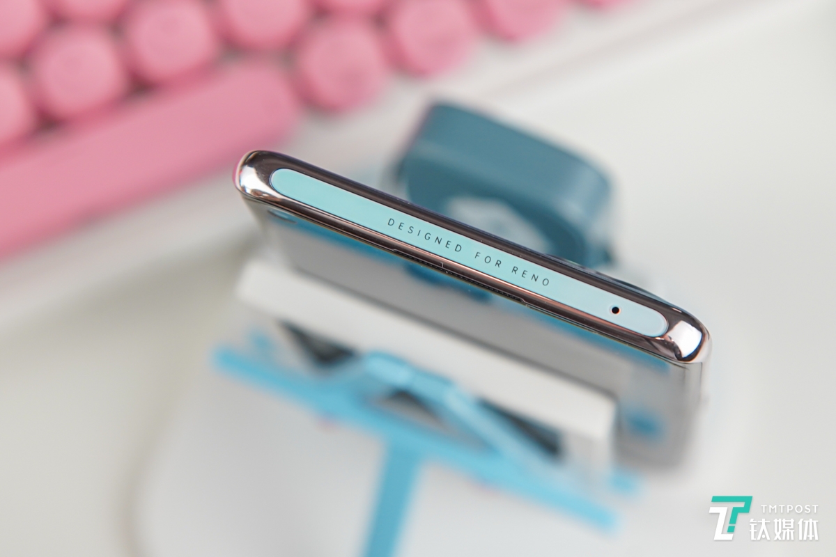 在整个机身上,Reno5 Pro并没有设计外漏的天线带,取而代之的是顶部“月光镜圈”的设计,其标有“Design for Reno”字样,并加入夜光材质,经阳光(手电)照射后,可在暗处发出萤光。