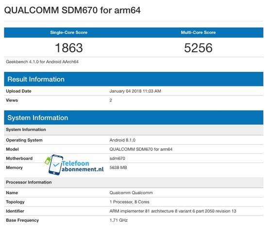 骁龙660现在有了自己的继任者骁龙670,并且荷兰手机站点telefoonabonnement从Geekbench4上拿到了骁龙670的跑分,这也是骁龙670跑分首次被曝光。根据截图显示,骁龙670的单核跑分为1863分,多核跑分5256分,采用8核心设计,小核主频是1.71GHz。另外这颗芯片是基于Kryo自研核心设计,跟之前的骁龙845是完全一致的。之前有爆料显示,骁龙670 的大核心是基于A75的Kryo 360,小核心是基于A55的Kryo 385 silver。