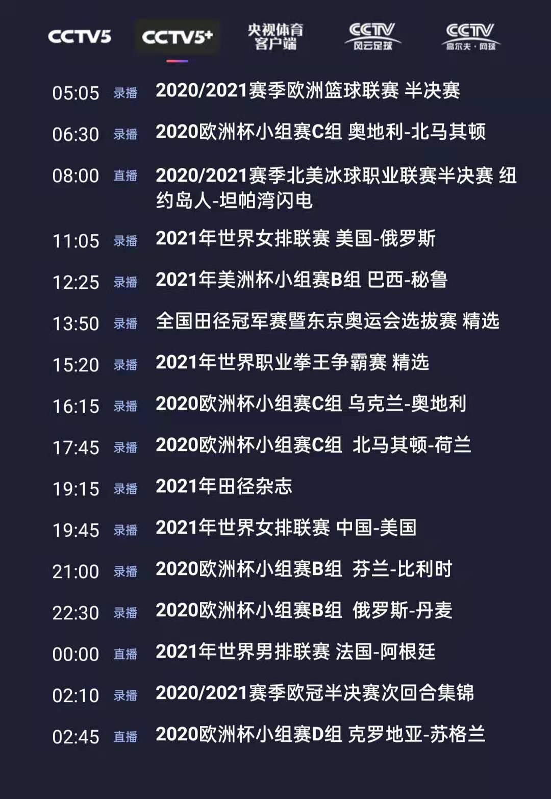 CCTV5+19:15赛事集锦-2021年田径杂志6。19:45实况录像-2021年世界女排联赛 中国队-美国队。