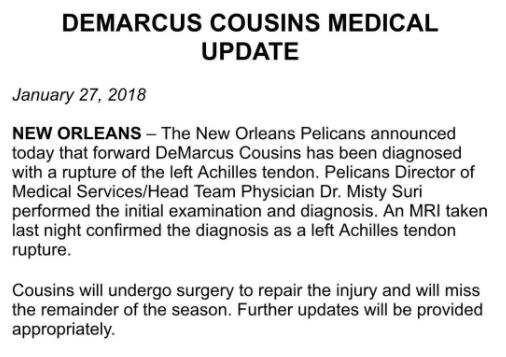 鹈鹕官方今天发表正式声明,考辛斯在昨天的比赛中遭遇左跟腱断裂,赛后的核磁共振检测也证实了这一点。考辛斯将接受跟腱修复手术,并缺席本赛季剩下的比赛。