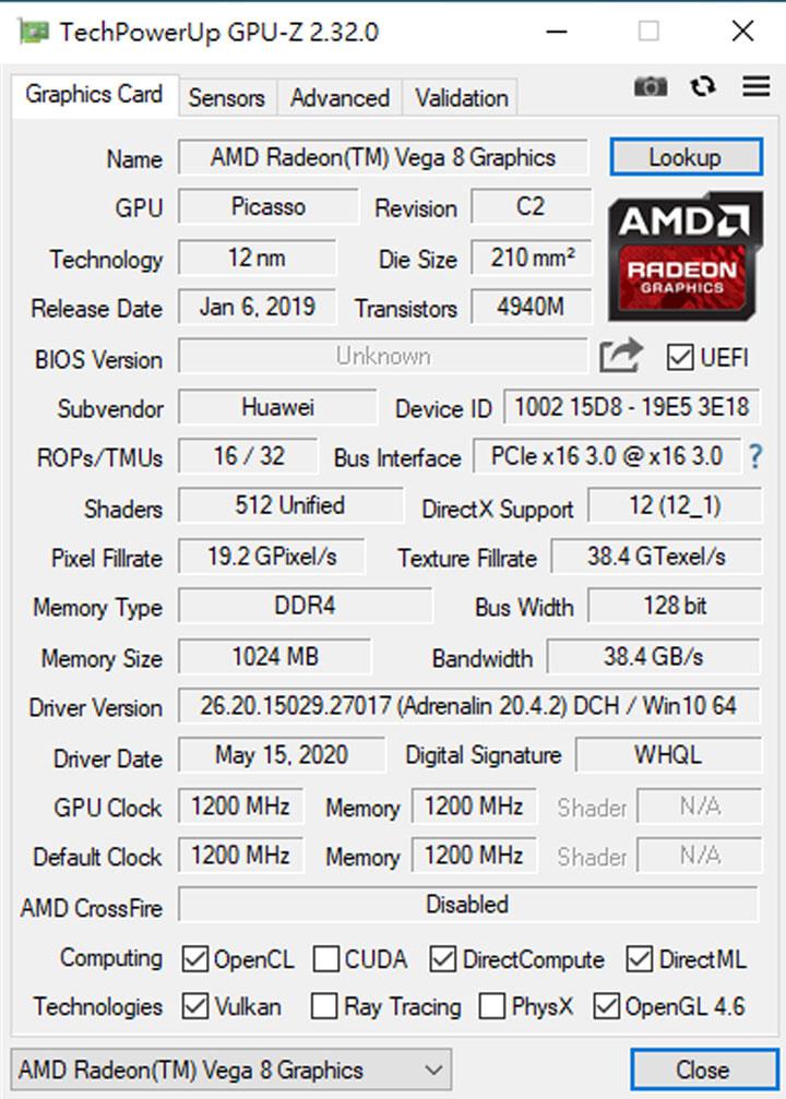 ▼通过 GPU-Z 来查看显示卡的相关资讯,采用的是与 CPU 整合的 AMD Radeon Vega 8 Graphics,在性能表现方面日常处理基本够用。