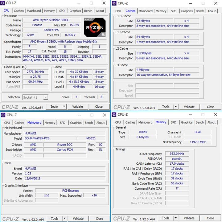 ▼通过 GPU-Z 来查看MateBook D的主要硬件信息,AMD Ryzen 5 3500U 采用 4核8线程 架构,最高 TDP 为 15W,三级缓存 4MB。