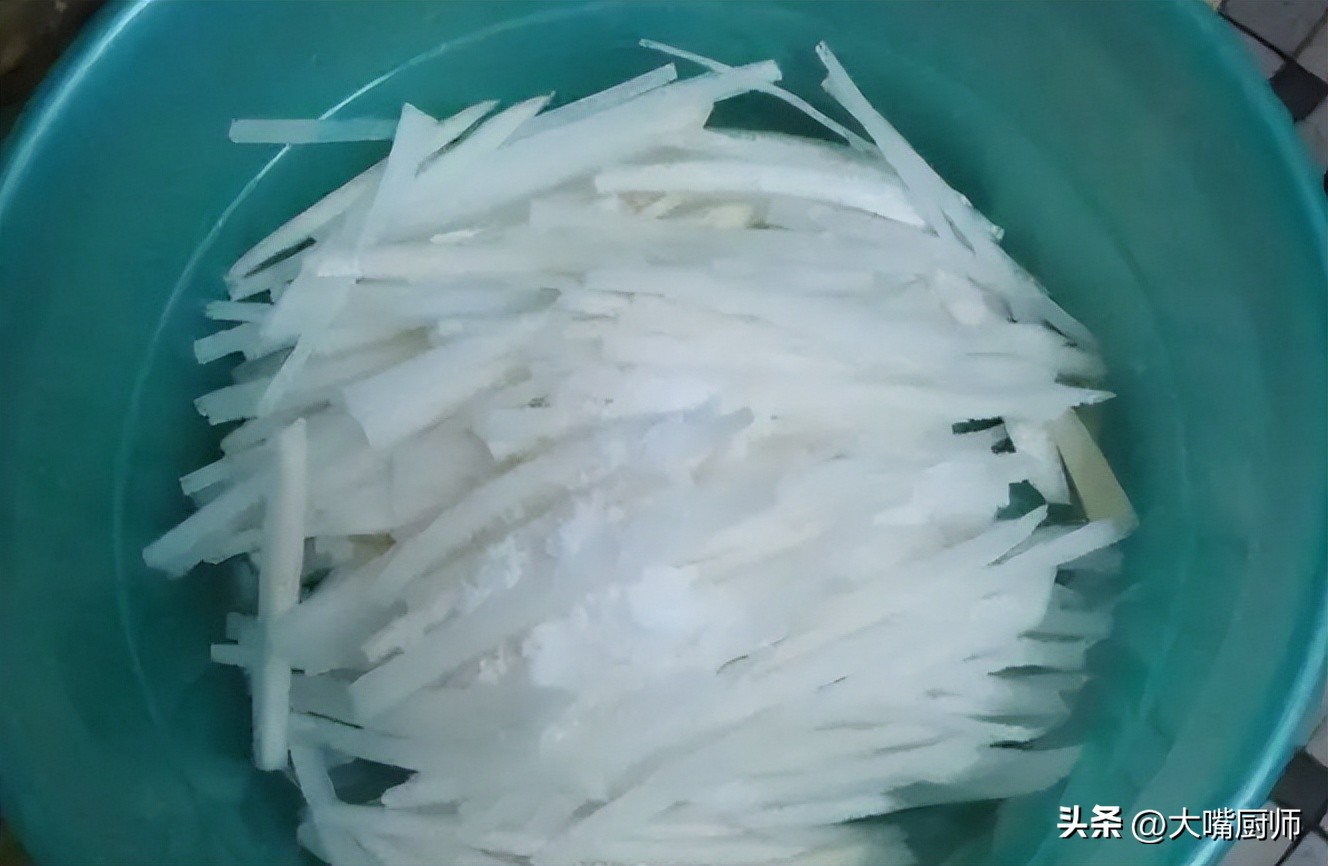 3、白萝卜去皮,擦成萝卜丝,放入小盆中,加入一勺食盐,翻拌均匀,腌制10分钟,杀出多余的水分。10分钟用手挤干萝卜丝的水分,用多剁碎,加入一勺香油拌匀。