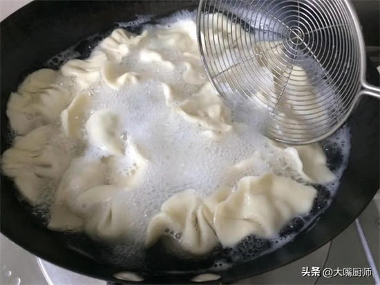 7、起锅烧水,煮饺子要多放一点水,这样饺子才不会粘连。水烧开后,加入一勺盐,倒入饺子煮一会儿,煮开后加一碗水,盖上盖子继续煮。
