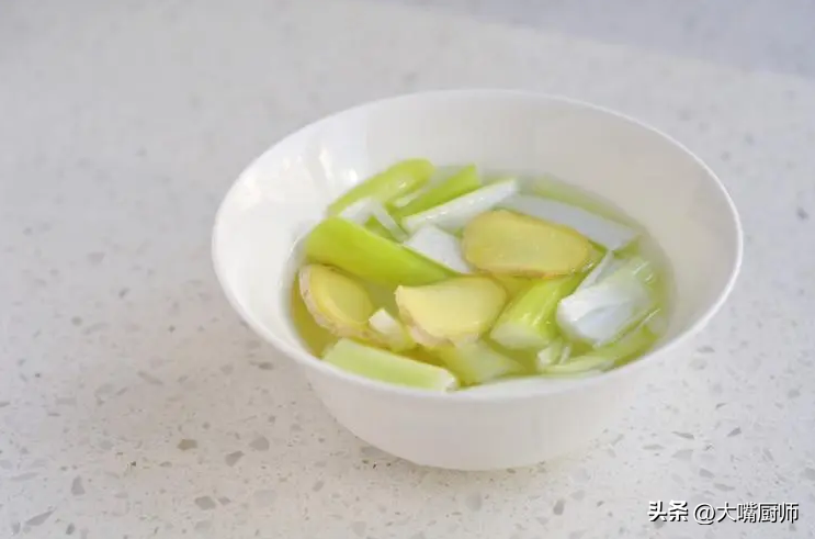 2、大葱切段,生姜切片,放入锅中,倒入一碗清水,小火煮5分钟关火,滤出葱姜水备用。把葱姜水分多次倒入肉馅中,搅拌让肉馅吸收水分,这样饺子馅才会饱满多汁。