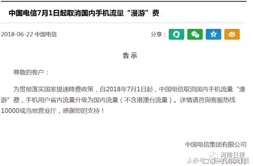 中国电信也在其官方网站宣布,自2018年7月1日起,中国电信取消国内手机流量“漫游”费,手机用户省内流量升级为国内流量(不含港澳台流量)。