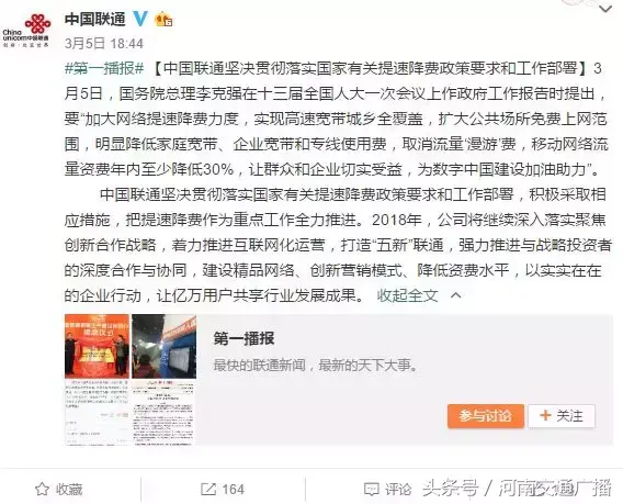 继中国移动之后,中国联通也于同日通过官方微博宣布:自2018年7月1日起,中国联通取消流量“漫游”费,新老手机用户的省内通用流量升级为国内流量(不含港澳台流量)。