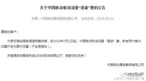 中国移动22日在官网发布关于取消流量“漫游”费的公告,公告称,自2018年7月1日起,中国移动取消流量“漫游”费,新老用户省内流量升级为国内流量(不含港澳台)。