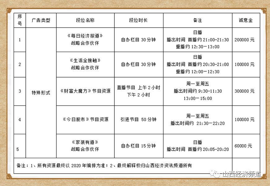 山西广播电视台经济资讯频道拟对2020年1月1日-2020年12月31日广告资源进行招标公示。根据《广告法》和国家相关法规允许在电视媒体播放广告并符合山西广播电视台相关管理规定的企业,均可报名参与投标。