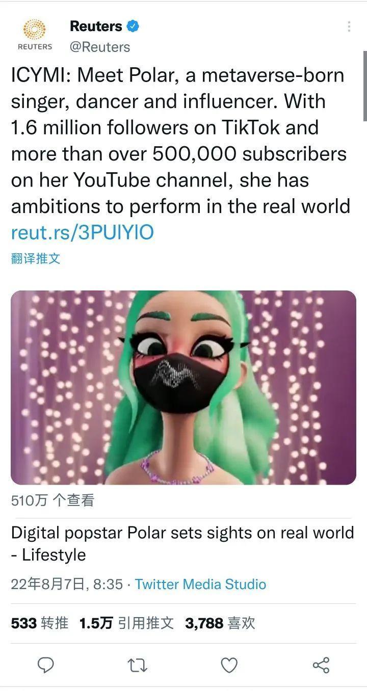 近日,路透社在推特发布了一篇元宇宙虚拟人的报道,介绍了元宇宙的虚拟世界歌星Polar。