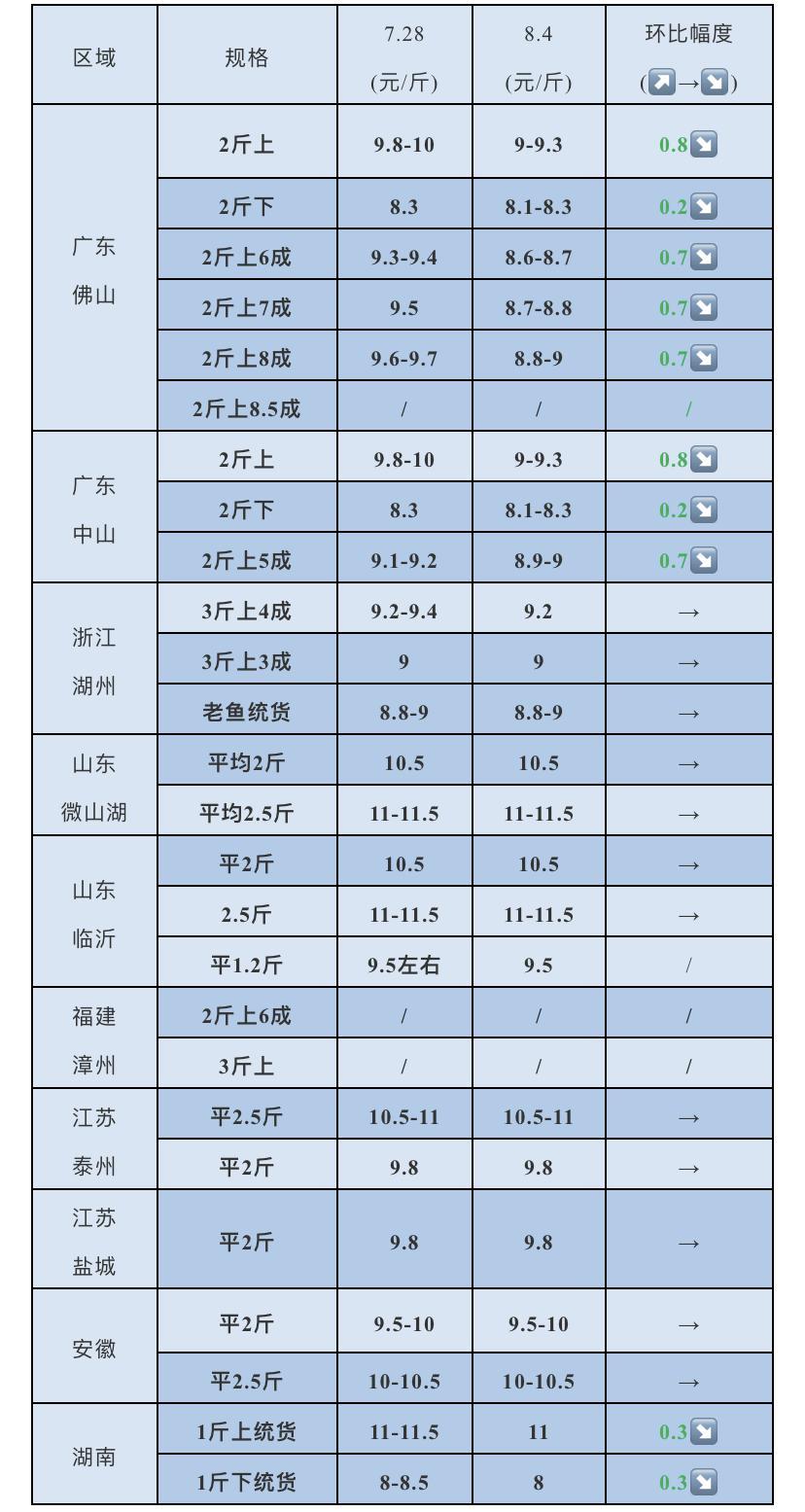 山东本周价格维稳。当地能出的鱼很少,价格有所上调。目前平2斤价格为10.5-11元/斤,平均2.5斤价格为11-11.5元/斤。业界认为随着市场存塘量减少,加上高温影响,特别是近期疫情影响,可能价格短期内暂时维稳!