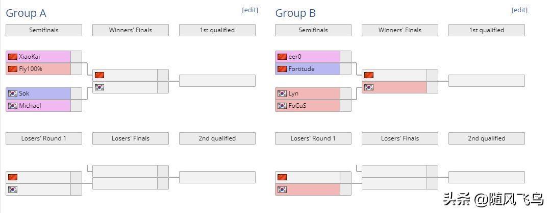 A组 Fly对Xiaokai应该毫无悬念,fly胜出,路西法最近打Sok也是负多胜少,Sok打UD最近非常猛,120不用小强也赢不了sok,sok胜出,胜者组Fly vs Sok,Fly稳扎稳打赢面还是很大的,Fly赢出线,sok进入败者者无论面对谁也基本出线,不出意外A组Fly和Sok出线