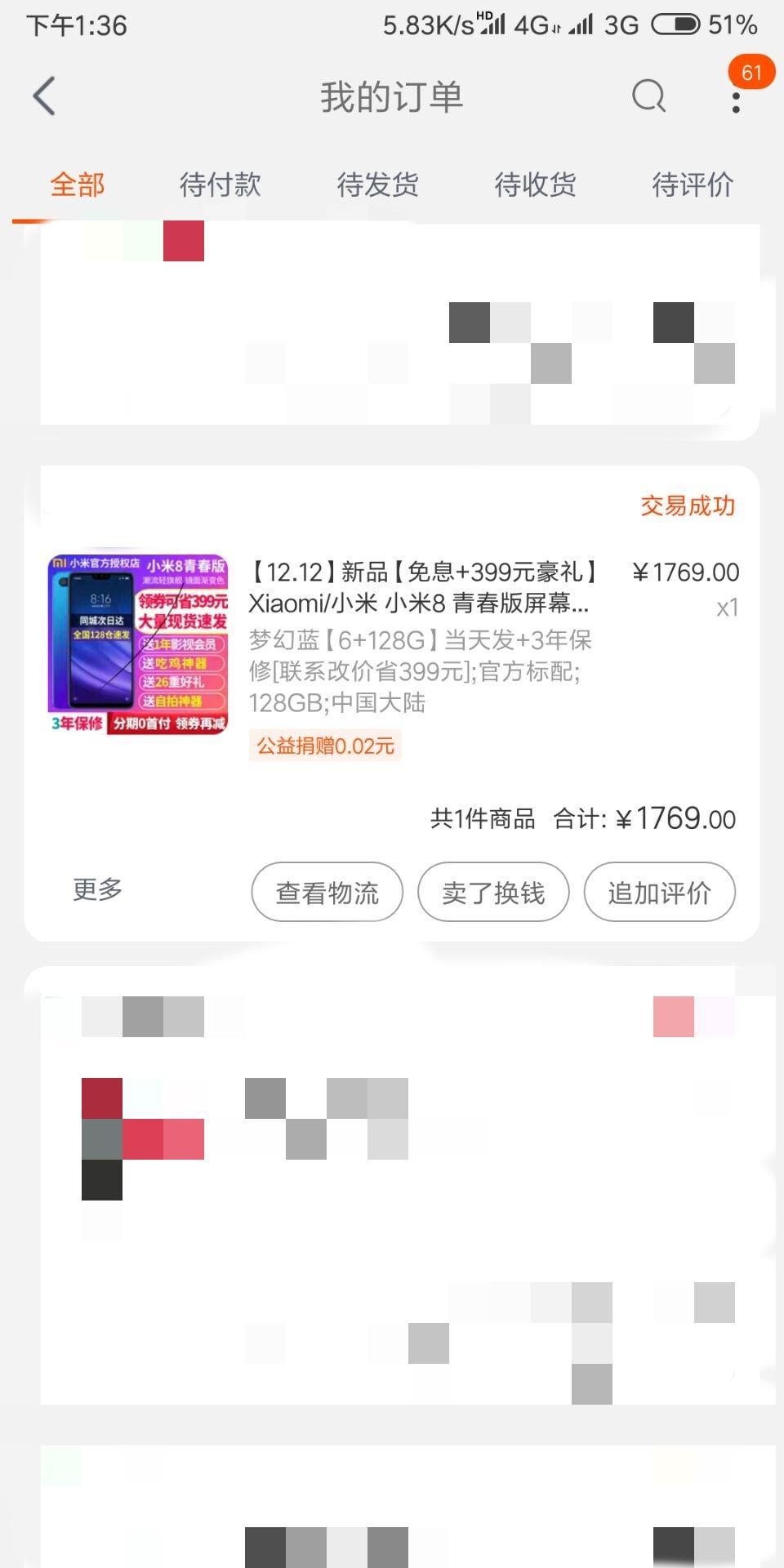 小武当时购买的是6+128g梦幻蓝,当时花了1769,给大家看下我的订单,这款手机在官网卖的是1999(高配版)。