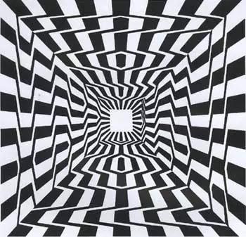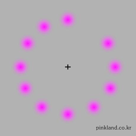 Ps:实际上是紫色的,可是只要你盯着中间的十字架专注地看,很快你就会发现,哪个闪烁的点变成了绿色的。更为奇妙的是,当你的眼睛看成斗鸡眼的时候,只有绿点在动,所有的紫点在一个一个消失。一圈一圈,最后一个也没了!