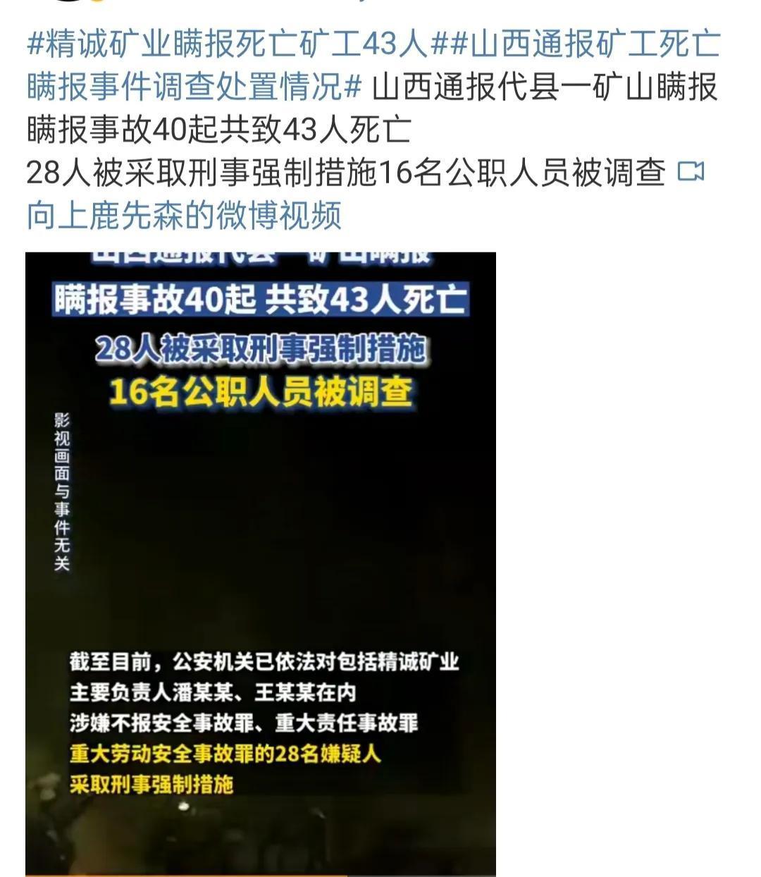 山西通报代县一矿山瞒报事故40起共致43人死亡,28人被采取刑事强制措施16名公职人员被调查。