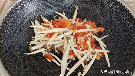 第三步:锅里烧油,先把葱花和西红柿下锅翻炒,炒出西红柿的汤汁时最佳。而后加入蟹味菇翻炒均匀。