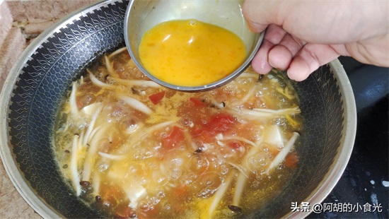 第五步:准备水淀粉将汤汁勾芡至稍微浓郁的状态,注意勾芡过程中要保持大火,边倒入边搅拌,再将备好的鸡蛋液淋入锅中就可以出锅。