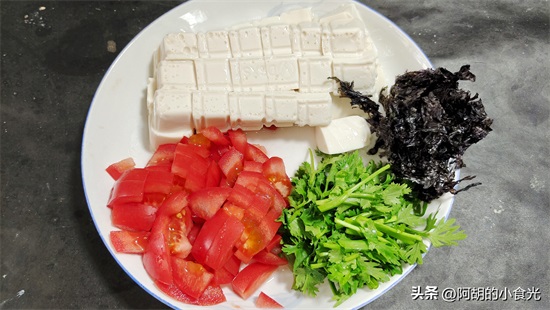 第二步:准备一个西红柿切成小粒,鸡蛋两个打散后备用,内酯豆腐一盒倒出后用刀轻轻地切成小方块备用,再准备一点香菜碎和紫菜。