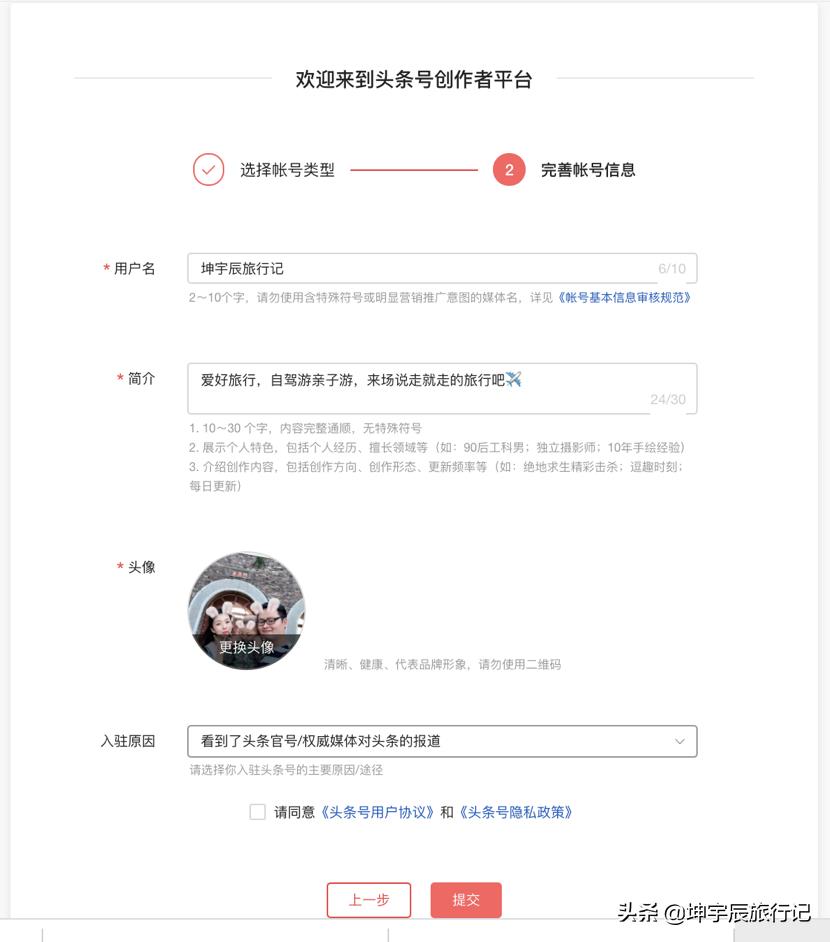Setp4:如果你手机号已经注册过今日头条了,就会带出你之前的用户名和简介,如果第一次注册就写下用户名跟简介(方便别人更清楚的了解你),选择头像,和入驻原因,勾选同意,点提交。