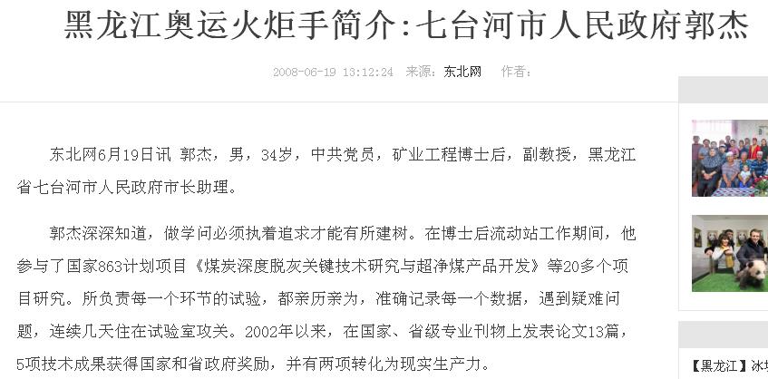 记者整理发现,2008年6月郭杰作为黑龙江奥运会火炬手的简介登上了当地网站,据东北网消息,那时郭杰正34岁,任龙江省七台河市人民政府市长助理。据该简介介绍,在郭杰博士后流动站工作期间,他参与了国家863计划项目《煤炭深度脱灰关键技术研究与超净煤产品开发》等20多个项目研究。所负责每一个环节的试验,都亲历亲为,准确记录每一个数据,遇到疑难问题,连续几天住在试验室攻关。2002年以来,在国家、省级专业刊物上发表论文13篇,5项技术成果获得国家和省政府奖励,并有两项转化为现实生产力。