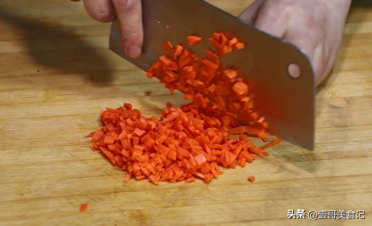 3. 准备一根胡萝卜,放进清水中清洗干净之后,控干水。然后,把它放在案板上,先用削皮器将胡萝卜皮全部给削掉,然后用菜刀将它的根部和头部给切掉不要。接下来,把剩下的部分先切成胡萝卜片,再切成条,最后,切成胡萝卜碎丁。