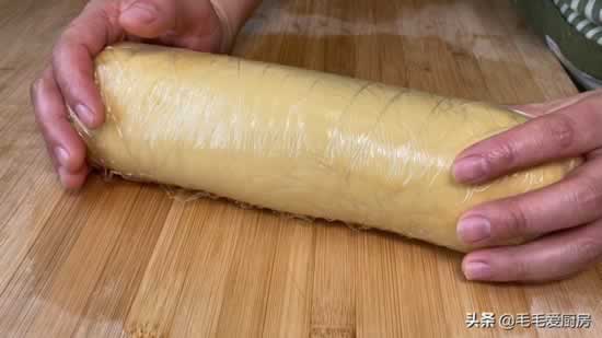 5、就这样的布局重复3次,让料粉和面充分的融合后炸出来的油条才会蓬松一致,最后把面拆光就可以取出来了,把揣好的面放在案板上直接搓成长条,上面再抹上一层食用油,用保鲜膜包起来醒面一个小时,面筋性大如果醒发时间不够你也擀不开,也不会擀均匀。