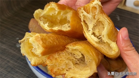 掰开看一下里边都是空心的,蓬发效果特别好,用冷冻的方法做油条只需一次操作一个月都不用早起,节省时间,随吃随取。