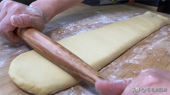 6、面醒好之后在案板上撒上一些干面粉,把醒好的面取出来轻轻的把面拉长,再用擀面杖擀一擀感到薄厚均匀,醒到位的面很松,拉开后也不会回缩。