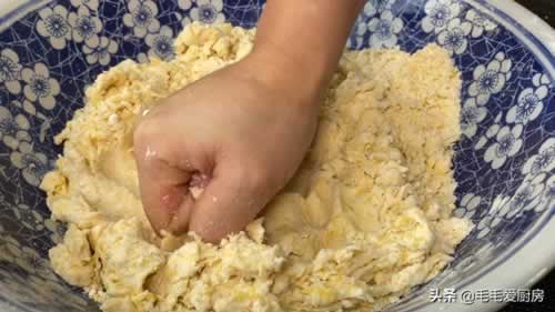 3、搅成面絮状再下手和面,和这个面的时候用揣的方法不能揉,揣面能够把粉料和面粉充分的融合均匀,如果揉的话达不到这样的效果,第一遍揣到基本不粘手的时候,表面抹上一层油盖上盖子醒面10分钟。