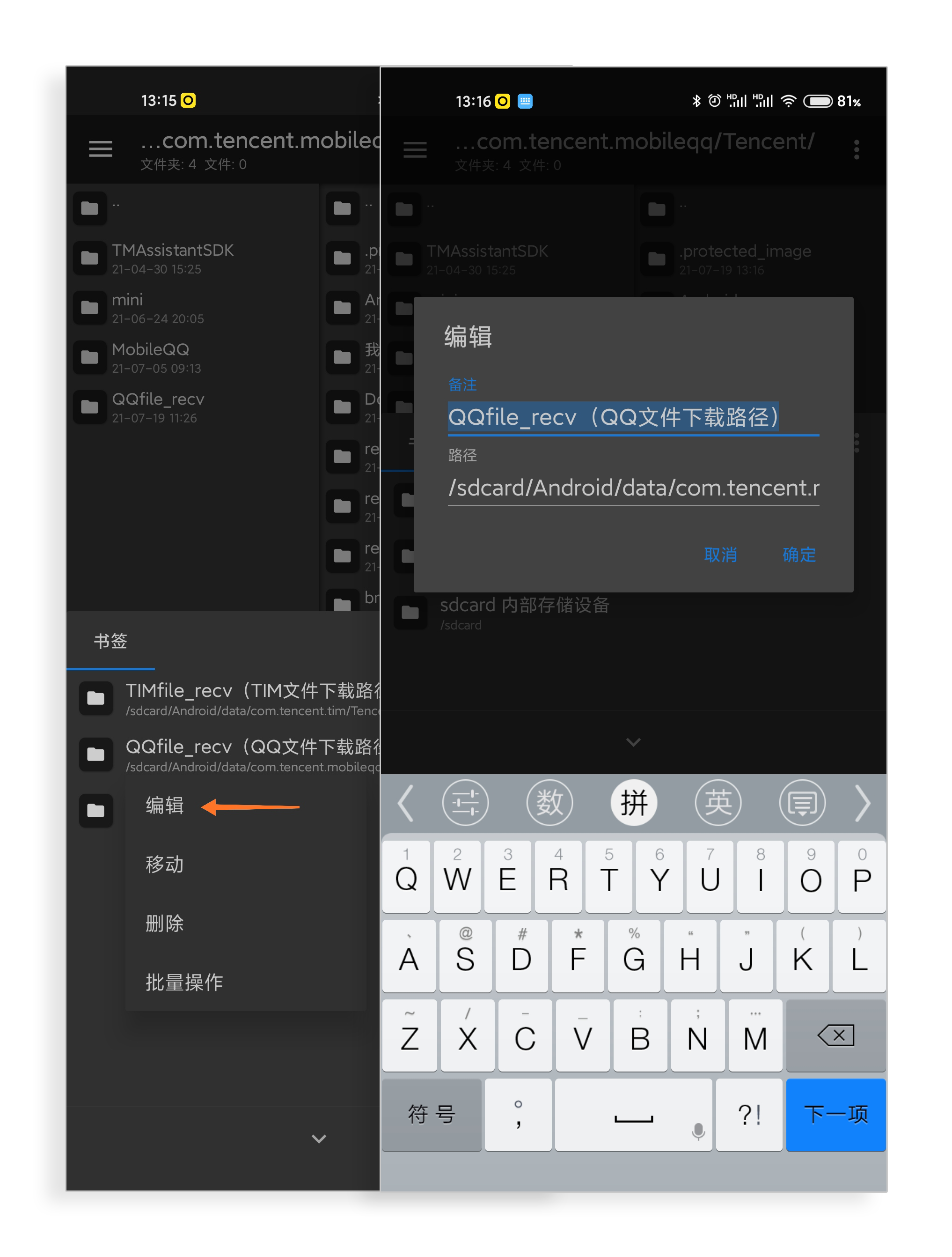 之后进入MT管理器,上滑底部工具栏进入添加的书签,就可以快速进入QQ下载目录了。其他目录添加书签类似。 添加的书签目录可以长按编辑,修改书签名称: