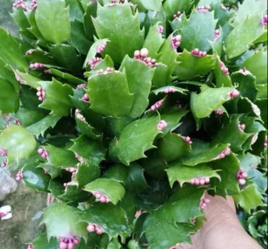 蟹爪兰的花期一般在11月份左右,在10月份左右开始分化花芽,一般到了10月份中旬开始分化花芽。看到有花苞长出来,把一些较小的叶片,不饱满的叶片轻轻掐掉。小的叶片比较薄,养分比较少,开花也不会好,还会消耗养分。掐掉小的叶片,它就会从老叶片上长出花苞。因为掐掉叶片会节省一些养分。所以花苞会长的比较肥壮,一个叶片上可以长2~3个花苞。