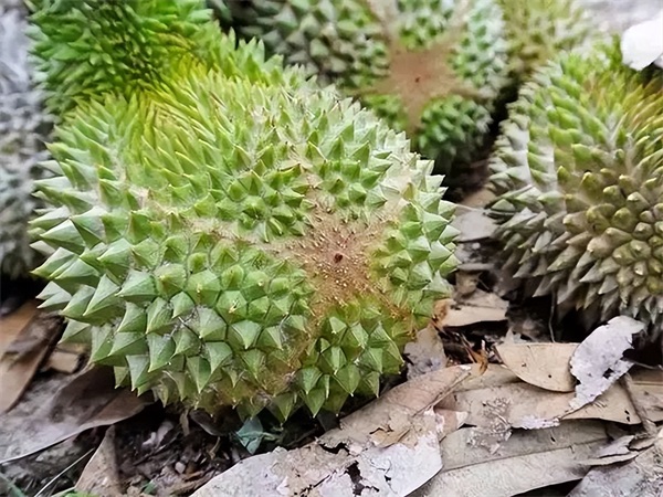 3.看颜色,成熟的猫山王榴莲果皮一般是青绿的,老树的果一般是土褐色的。