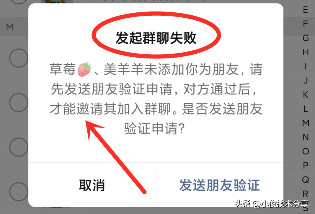 接着就会跳出【发起群聊】页面,在这里我们就可以邀请好友群聊,那么如果已经把我们删除的好友呢, 就无法添加到这个群聊,而且还会提示【发起群聊失败】,需要我们发送好友验证申请,对方通过之后才能邀请其加入群聊!这样呢,我们也可以快速知道,好友是不是把我们删除了!