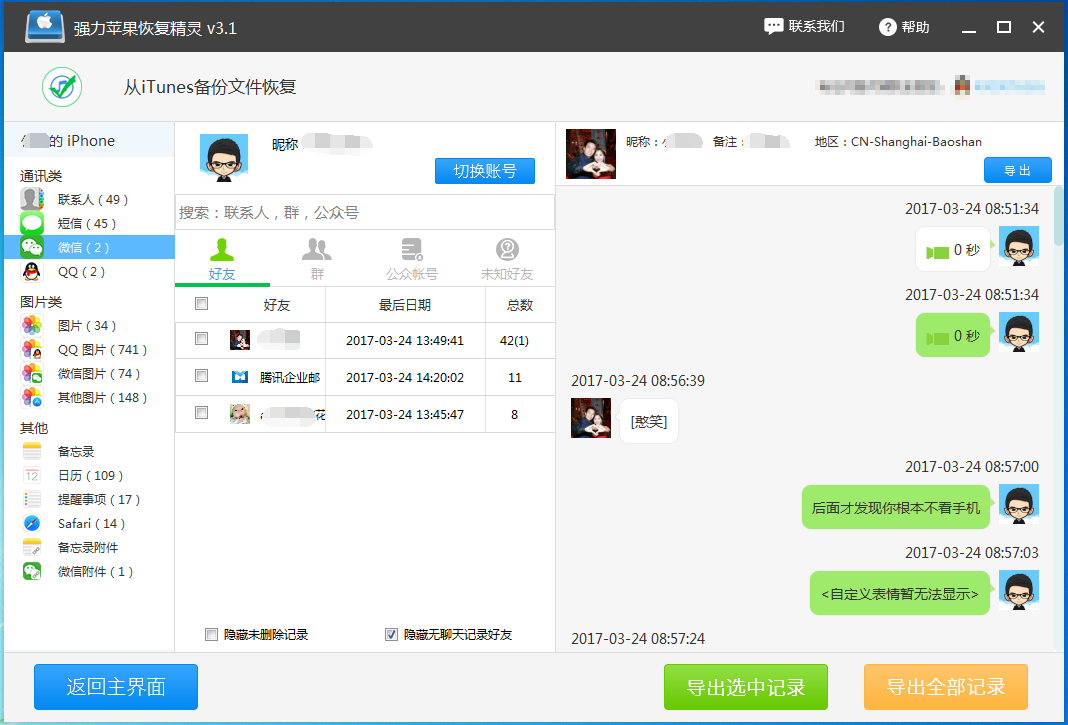6、点击软件界面左侧的“微信”选项后,在右侧的方框里,我们看到了全部微信聊天记录的,只要勾选出需要恢复的微信聊天记录,然后导出就可以了。
