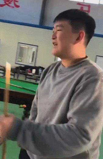 视频中,赵一楠长相憨厚,身材高大壮硕,一身灰色卫衣配宽松裤子,这一身休闲的打扮,一看就是方便活动筋骨的行头。只见他站在一张桌球台前,手上拿着桌球杆,先是沉思了一会儿,然后嘴上说了一句:“跟他打,干嘛那么认真”,边说这句话边挠头,嘴角还扬起了笑容,看起来信心十足。