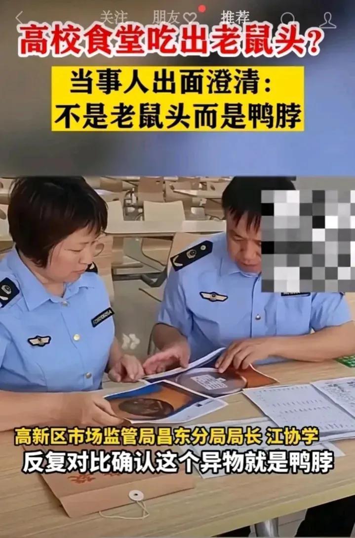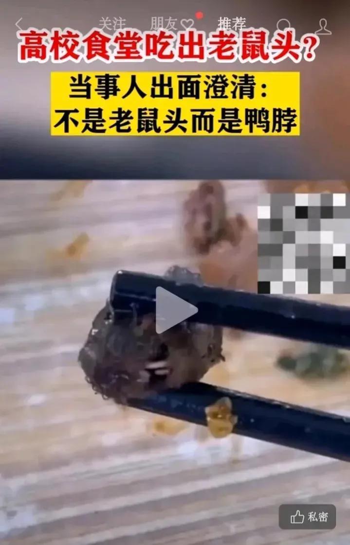 2、有意思的是后来发视频的当事人出来澄清说是鸭脖不是老鼠头,可大家还是怀疑。怀疑的理由也很正常,毕竟作为学校的学生有许多顾虑,受制于学校也很正常。不管当事人的反转澄清是不是真相,大家都能理解,不会因此去抨击他。能理解,但怀疑没有消除。