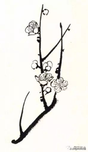 梅花老干坚硬、苍古,新枝劲健而富有弹性。新枝用狼毫笔蘸墨中锋用笔,起笑藏锋,收笔回锋,运笔一气呵成,枝杆线条方得劲健之感。生枝方向应大势一致,三枝穿插多以“女”字形排列,二枝不宜出现平行、垂直等交错关系。↓↓↓