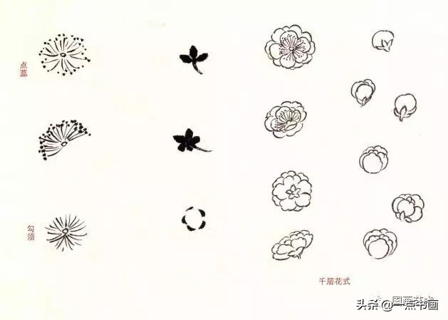 花的画法有两种,一种为勾勒法,一种为没骨法。勾勒法用狼毫笔蘸淡墨,中锋用笔圈花,每个花瓣用一笔或两笔画成,用笔要轻松灵活。盛开的花,花瓣应围绕花蕊向外成放射状,不同的角度,花的形状不同,要注意多观察、多练习。