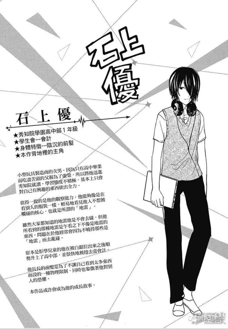 好啦,说完了缺点,我们来说说石上的优点,作为学生会此时唯一的一年级成员,石上不光有着出色的财务能力。同时他也是一个正直且无比细腻温柔的男生。也正是因为这份无法言说的温柔,使他一直以来都活在别人冷暴力中,没有办法得到救赎。直到学生会长的到来...