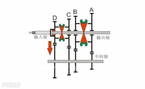 发动机动力经过离合系统后,通过输入轴进入变速箱内部。输入轴和齿轮D刚性相连,它带动齿轮D转动,把动力传递给中间轴,中间轴再通过齿轮啮合运动,把动力传递到输出轴上的A、B、C三个齿轮上,由于三个齿轮是空套在输出轴上,因此只能通过同步器,依靠同步器内花键带动输出轴转动,然后把动力输送到变速箱外部。
