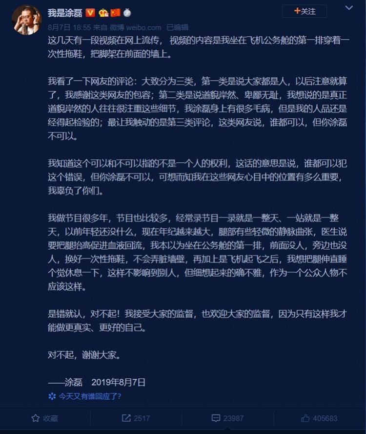在事件曝光的当天晚上,涂磊便在微博上发表长文,做出了详细回应。据涂磊所说,因为常年主持节目,他的腿部有轻微静脉曲张,医生嘱咐他要把腿抬高以促进血液回流。当天,他坐在公务舱第一排,前方和旁边都没有人,还特地换上了一次性拖鞋,才抬起腿蹬着机舱、想要休息一下的。他表示:“细想起来的确不雅,作为一个公众人物,不应该这样。是错就认,对不起!我接受大家的监督,也欢迎大家的监督,因为只有这样,我才能做更真实、更好的自己。”