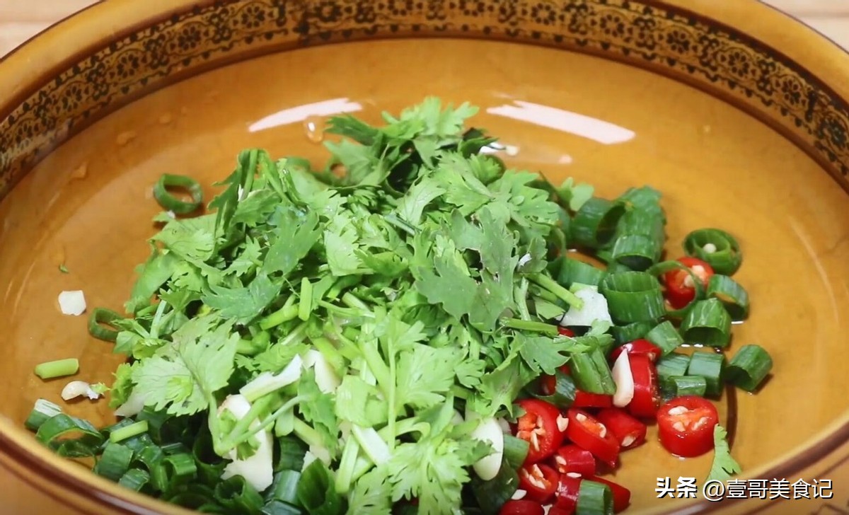 5.现在,给装着葱花蒜沫等配料的大碗里,先放进去一些食盐和白糖,还要加入一些胡椒粉,然后,再倒进去一些生抽,陈醋需要多倒进去一些。接着,加一勺子辣椒油,滴入一些香油。最后,倒进去温水,用筷子搅拌均匀,料碗就准备好了。