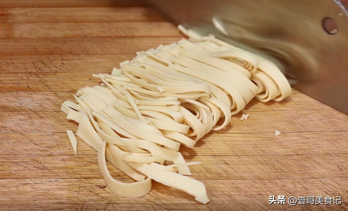 6.准备半张豆腐皮,先用清水将表面冲洗一遍,然后捞出来晾干水。接着,将豆腐皮从中间切开,再叠放在一起,用菜刀将它们切成细细豆腐条。将切好的豆腐条放在盘子里,待用。